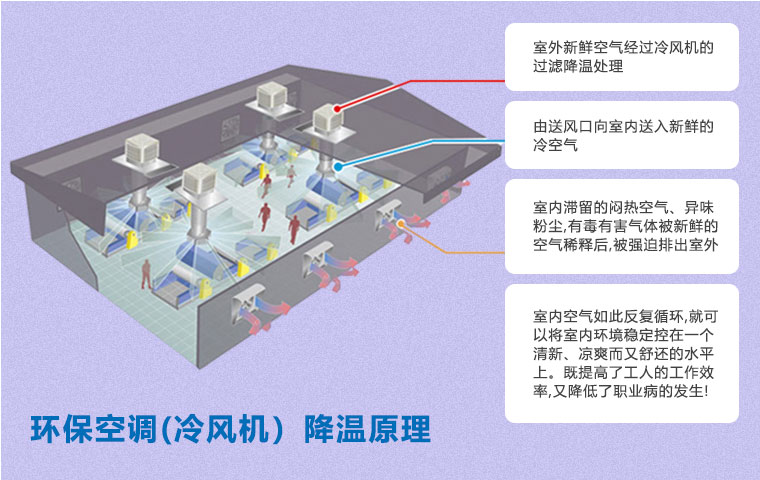 在空氣不流通的環(huán)境中,尤其是化工車間,容易產(chǎn)生建筑綜合癥,如悶熱、頭疼、眩暈、過敏、咳嗽等不適癥狀。使用環(huán)??照{(diào)(冷風機)通風降溫方案即可以有效降溫,又能保證空氣流通
